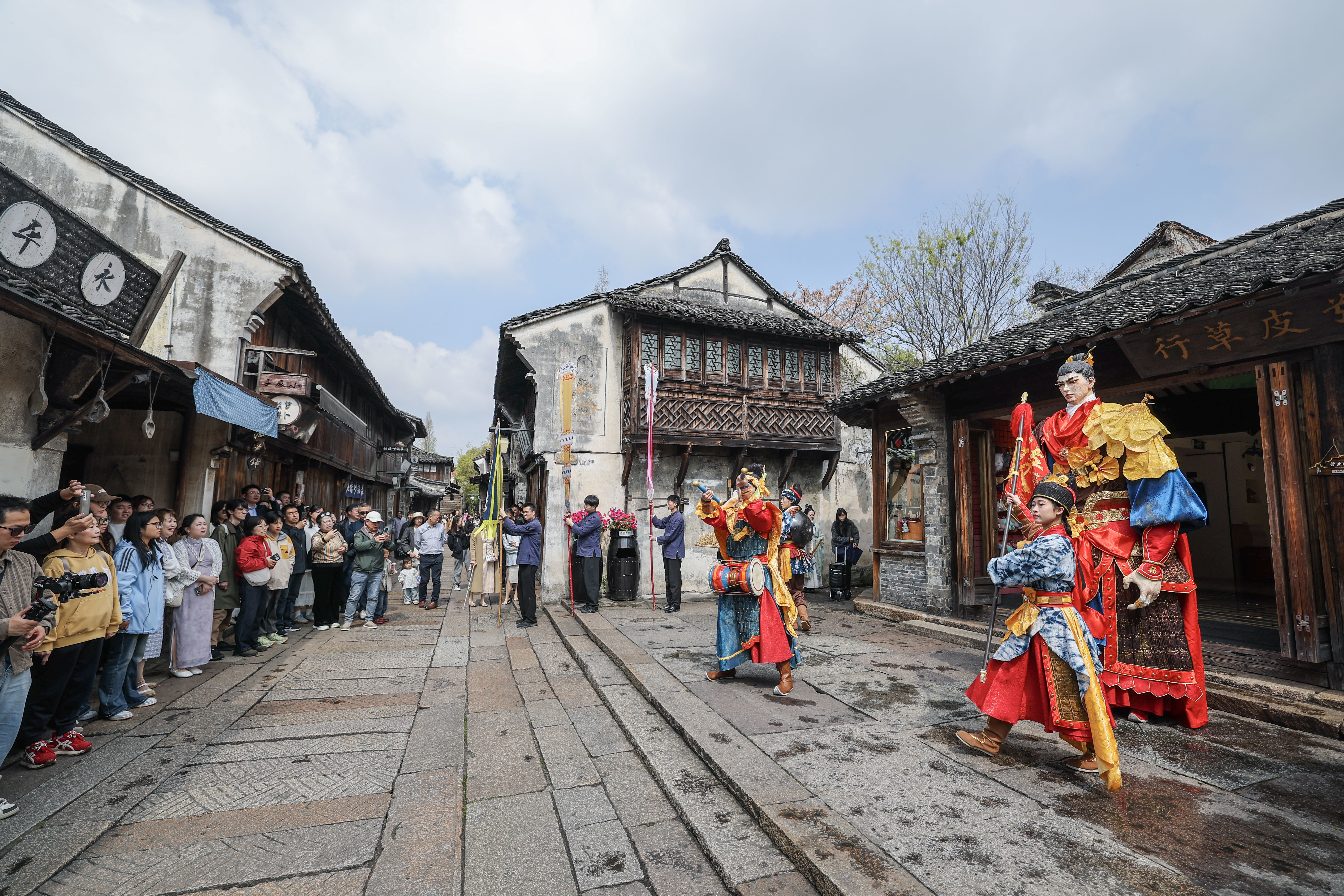 4月1日,乌镇香市蚕花嘉会的巡游戎行在古镇的市井上饰演。
